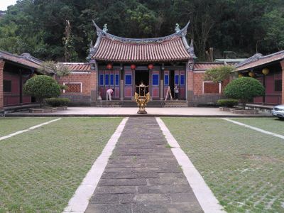 The temple follows a traditional sanheyuan design with one central hall and two side wings near the Tamsui River foothills.