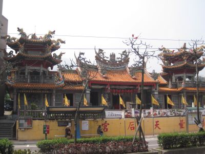 The Kaitian Mazu Temple stands near the ferry pier in Bali District, featuring traditional Chinese architectural elements with detailed stone carvings and decorative pillars.
