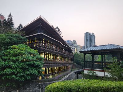 The Beitou Hot Spring Museum is a former public bathhouse in Beitou District, Taiwan, that now tells the story of thermal springs. The structure shows Japanese building style with wooden beams and two floors where exhibition pieces and old photographs are displayed.