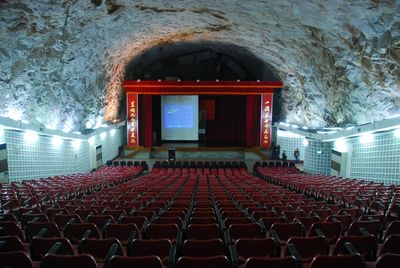This granite cave hall extends over 80 meters in length, 50 meters in width, and reaches 12 meters in height, accommodating 755 seats.