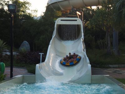 The park contained the longest water slide in Southeast Asia, offering views of Guanyin Mountain during the descent.