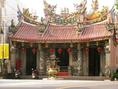 The temple features stone carvings of figures and flora created by master craftsman Chang Huo-kuang, alongside wood carvings by skilled artisan Yeh Chin-wan.