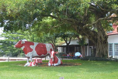 Life-sized cow statues positioned throughout the grounds serve as popular photography spots and symbolic representations of the ranch's dedication to cattle farming and dairy production heritage.
