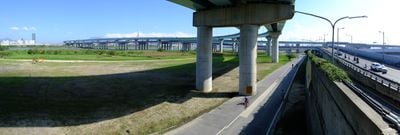 Chongcui Bridge crosses the Dahan River and links multiple districts of New Taipei City. It features separate roadways for cars on its main span, with dedicated lanes alongside for motorcycles, bicycles, and pedestrians.