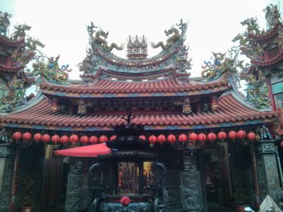 The temple represents the dual worship of Mazu, the sea goddess, and Guanyin, the Buddhist deity of mercy, reflecting Taiwan's religious synthesis.