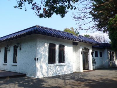 The Lin Yutang House features blue tiles and white walls in a combination of Chinese and Spanish architectural styles with a central courtyard.