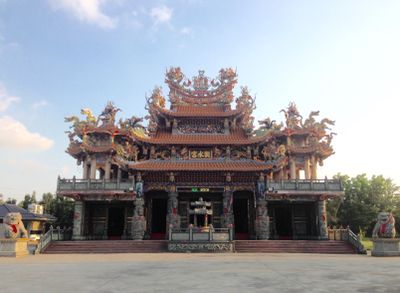 The Gunshuei Guanshuei Temple features traditional Taiwanese architectural elements with ornate carvings and colorful decorations throughout its multiple halls and courtyards.