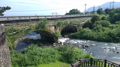 The bridge structure represents early 20th century engineering methods in Taiwan, combining railway and road designs in a single crossing point.
