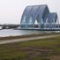 The building includes a white stone piano sculpture near the water, creating specific angles for photography against the glass structure.
