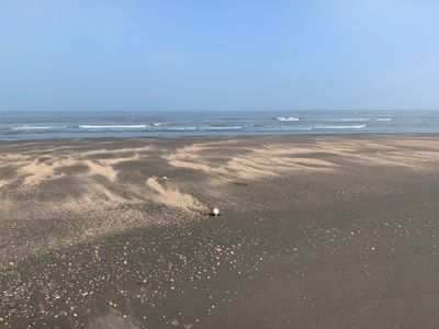 The beach features multiple large-scale wind power generators that provide renewable energy while serving as geographical markers for the region.