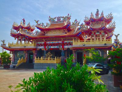 The Daqiaotou Cihfong Temple stands with traditional Taiwanese architectural elements, featuring decorative carvings and multiple halls dedicated to different deities.