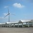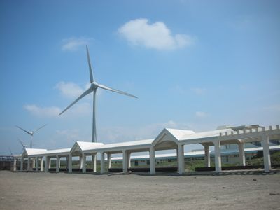 The beach extends along the northern coastline of Taiwan, featuring wide sandy shores bordered by large wind turbines near the waterfront.
