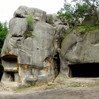 Dovbush Rocks is a sandstone formation that runs through beech forests with cliffs rising about 80 meters (260 feet) from the ground. Caves within the rock walls, both natural and carved, show evidence of long-term habitation with defined floor levels and organized spaces.