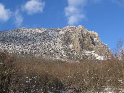 The mountain contains numerous unexplored rocky terraces and massive boulders that present geological formations specific to the Crimean Peninsula.