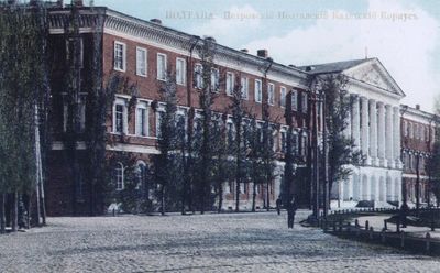 The Cadet Corps building features neoclassical architecture with symmetrical designs, columns, and ornate stone details across its main facade.