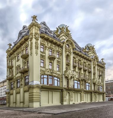 The Hotel Grand Moscow exhibits Art Nouveau architecture with detailed facades, organic forms, and elaborate decorative elements across its multiple floors.