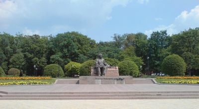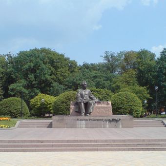 The entrance features a monument to Ukrainian poet Maksym Rylsky, whose name the park carries as recognition of his literary contributions.