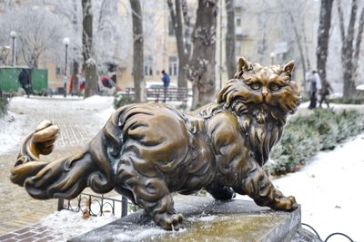 The bronze statue depicts a Persian cat in a natural sitting position, with specific details that make it appear realistic and lifelike at the site.