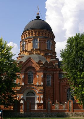 The Ozeryanska Church displays rounded arches, decorative mosaics, and a central dome, reflecting the Neo-Byzantine architectural style of the nineteenth century Russian Empire.