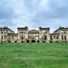 The stone structure exhibits neoclassical design elements with symmetrical proportions, columns at the entrance, and decorative architectural details across its exterior walls.