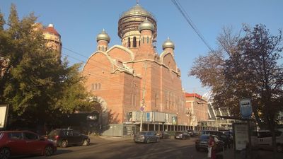 The Holy Trinity Church stands with Russian Revival architectural elements, featuring intricate ornamentation and traditional design patterns throughout its structure.