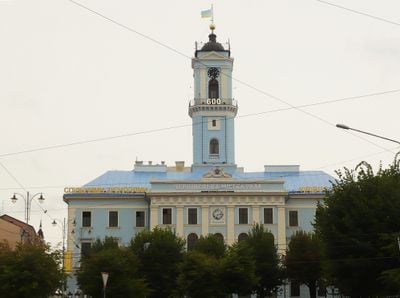 The Town Hall of Chernivtsi is a structure featuring late classical and Renaissance design elements, rising above the center of the main square with a soft blue facade. It contains a two-tier clock tower topped by an observation deck that visitors can reach by climbing interior stairs to see across the old town district and the surrounding river valley.