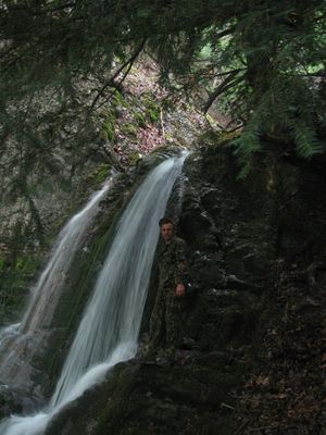 The Golovkinskogo waterfall drops from 9 meters in height, forming cascades through the dense mountain forest environment of the Crimean region.