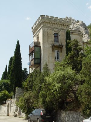 Located at 76 Sovetskaya Street in Simeiz, the villa offers views of the Black Sea and currently contains multiple residential apartments.