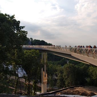 The crossing stands open to both pedestrians and cyclists, offering a direct link between the parks above and below. Visitors should mind the glass sections during wet weather, as these can become slippery.