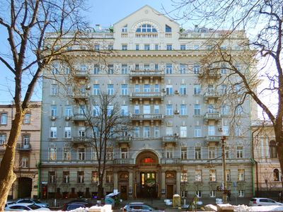 The apartment building combines Art Nouveau architecture with neoclassical elements, featuring ornate facades and symmetrical decorative patterns throughout its exterior design.
