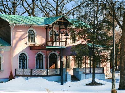 The residence at 130 Peremohy Avenue is a country house combining neoclassical and historicist design features, including a distinctive mezzanine level. The property contains several structures arranged for seasonal use with separate areas for dining and living.