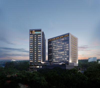 The Kampala Hilton Hotel spans across two towers with 19 floors for accommodations and 16 floors dedicated to office spaces, including five basement levels.