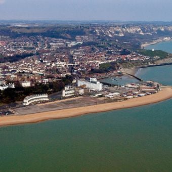 Folkestone is a coastal town in Kent that stretches along the Channel shore between Dover and Hastings. The Leas promenade runs above the coast through landscaped gardens and offers views across the Channel.