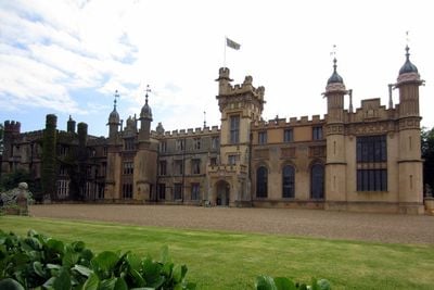 The red-brick Tudor Gothic mansion features extensive formal gardens, parklands, and distinctive architectural elements across its 250-acre grounds.