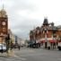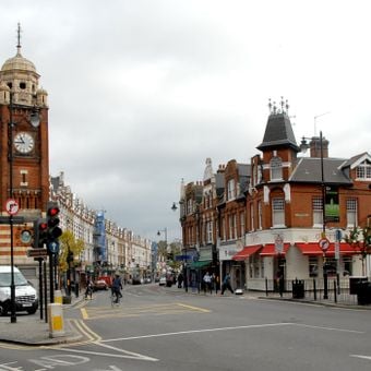 Crouch End is a residential neighborhood in North London organized around a junction marked by a red brick tower supporting a clock. The streets radiate from this center point and are lined with Victorian terraced houses, small shops, and dining spaces in two-story buildings.