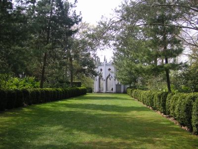 The 158-acre landscape garden contains a lake, Gothic Temple, vineyards, and walking paths across varied natural terrains and structured gardens.