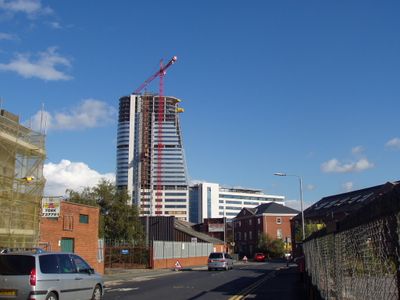 The structure, designed by architectural firm Aedas, combines residential apartments and office spaces, reflecting modern urban development trends in British cities.