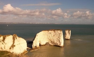 The white chalk stacks and stumps of Old Harry Rocks rise prominently from the sea, marking the eastern edge of the Jurassic Coast.