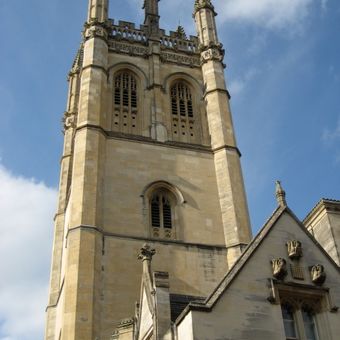 Magdalen College is a college of the University of Oxford in Oxford, England, covering roughly 100 acres along the River Cherwell. The site includes a great tower, cloisters, chapels, a library, and wide open spaces with meadows and tree groves.