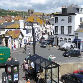 Lyme Regis is a coastal town in Dorset that sits on a series of hills overlooking the English Channel. The settlement spreads around a small working harbor, with narrow streets climbing between stone buildings and terraced houses.