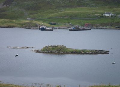 The stone structure stands on a rocky islet in West Burra Firth, featuring four internal mural cells and two guard chambers near the entrance passage.