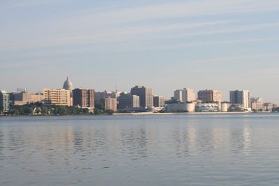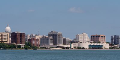 The Wisconsin State Capitol building stands at the center of downtown, featuring a 267-foot granite dome topped by the gold-leafed Wisconsin statue.