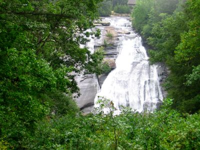High Falls is a waterfall in DuPont State Forest that drops about 150 feet over granite cliffs in multiple tiers, flowing through the forested Tuckasegee Gorge. The cascade system changes in appearance depending on the season and water releases from nearby infrastructure.