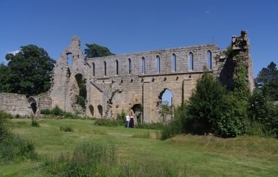 The remains display substantial stone walls and architectural elements from the original monastery, including parts of the church and water mill alongside the River Ure.