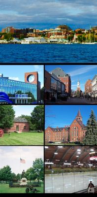 Located on the eastern shore of Lake Champlain, Burlington contains multiple neighborhoods with colonial buildings and red brick structures along Church Street.