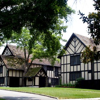 Agecroft Hall is a Tudor-style manor house that was transported from England to Richmond. The building features half-timbered walls, mullioned windows, and ornamental chimneys set on extensive grounds overlooking the James River.