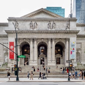 The New York Public Library is the headquarters for a large network of public libraries across Manhattan, the Bronx, and Staten Island. The main building on Fifth Avenue features marble staircases, arched hallways, and two stone lions at the entrance.