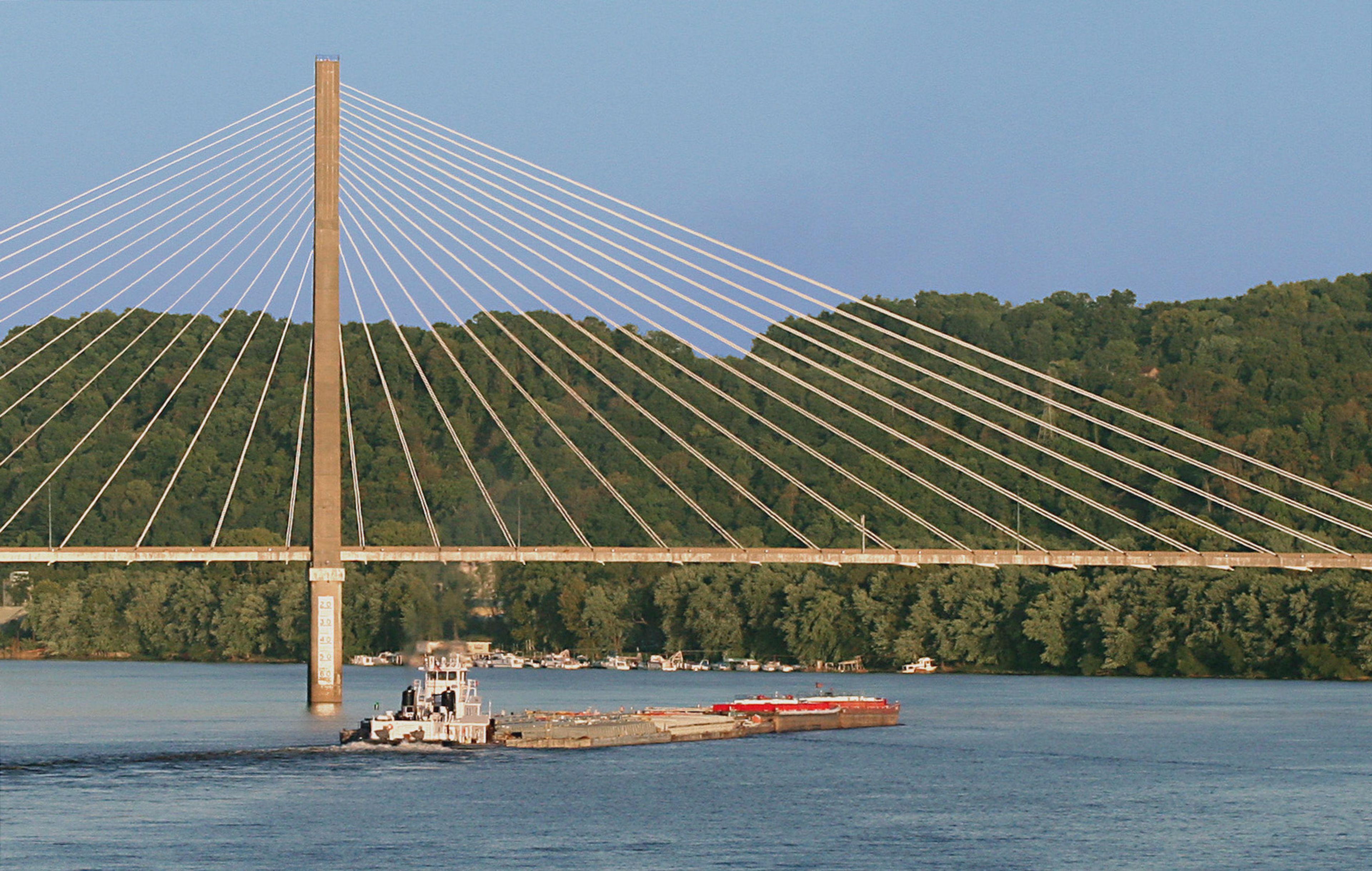 The East Huntington Bridge spans 3,787 feet across the Ohio River with 31 pairs of steel cables anchored to a single 280-foot-tall tower.