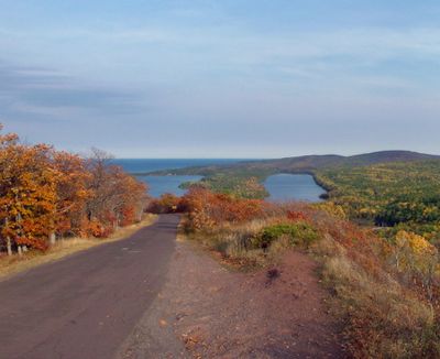 Brockway Mountain Drive extends for 8.8 miles along a ridgeline, reaching an elevation of 1,320 feet above sea level in Michigan's Upper Peninsula.