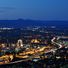 Roanoke extends along the Roanoke River near the Blue Ridge Mountains, with streets laid out in a grid pattern across the valley floor. Downtown sits in a basin surrounded by forested hills that rise on all sides.